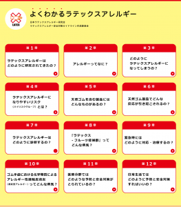 ラテックスアレルギーの原因や症状、検査・治療、医療や日常生活での予防対策などを、安全対策ガイドラインに基づき、基礎知識から具体的な対応まで体系的に学べる解説サイトです。