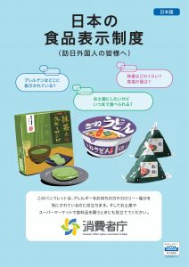 訪日外国人が日本の食品表示や食物アレルギー表示を理解できるよう、表示の見方や注意点、原材料表示の読み取り方などを、多言語でわかりやすく紹介した啓発パンフレットシリーズです。